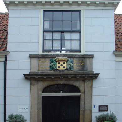 "Fondatie van Sa Christina Ghijsberts weduwe wylen meester Floris Henricken Letmaet. Anno 1625". Schilderachtig POORTGEBOUWTJE van alleen parterre onder hoog zadeldak met schoorstenen.