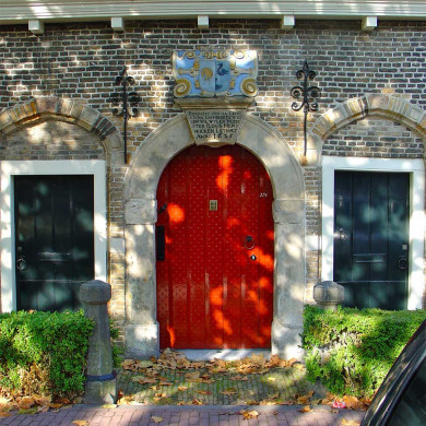 "Fondatie van Sa Christina Ghijsberts weduwe wylen meester Floris Henricken Letmaet. Anno 1625". Schilderachtig POORTGEBOUWTJE van alleen parterre onder hoog zadeldak met schoorstenen.