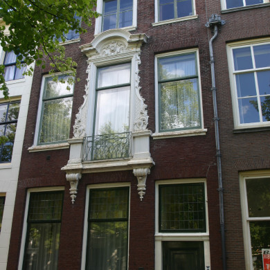 PAND met lijstgevel in Lod.XIV-vormen met siervazen aan weerszijden van het middenvenster in de parterre, rijk versierde omlijsting van het middelste verdiepingsvenster, hardstenen vensterdorpels en verdiepte kroonlijst met consoles. Smeedijzeren raamhek voor het middelste verdiepingsvenster. Stoephekken.