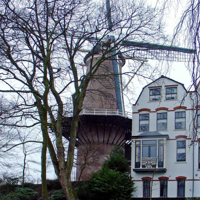 STELLINGMOLEN 't Slot' (1832) met molenaarshuis er naast. Ingezwenkt lijstgeveltje met voluten uit dezelfde tijd als de molen.