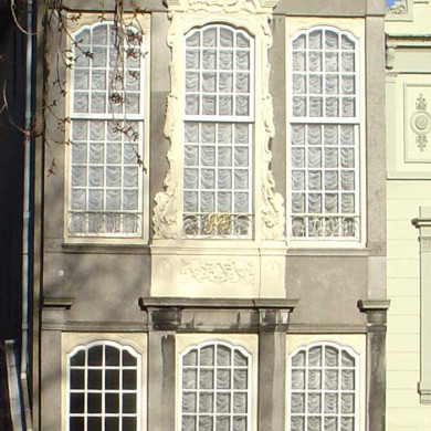 Getoogde vensters. Raamhekken voor de verdiepingsvensters. Hardstenen plint met Lod.XV-ornament.