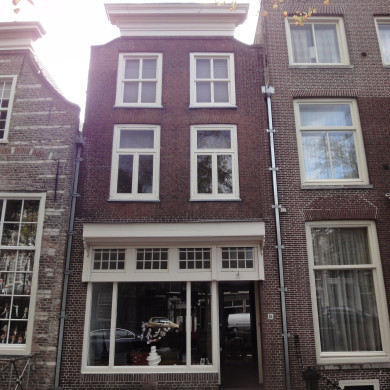 PAND met lijstgevel, boven XIX A, onder XVIII, met zeer fraai gesneden voordeur, Lod.XV en rozetten (XIX) in de kroonlijst. Mezzanino. De gevel wordt ontsierd door een modern balkon.