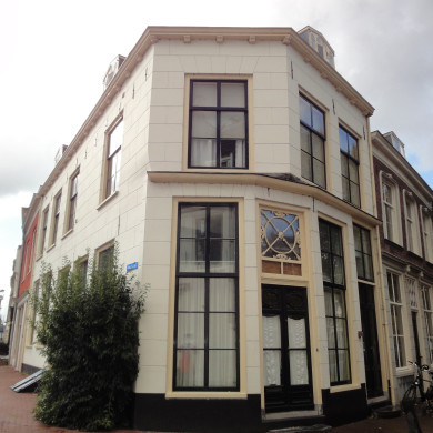 Hoek Veerstal. Twee vakken breed en langs de Veerstal vijf vakken diep PAND met afgeronde hoek. Gepleisterde gevels met Empire ramen. Deur en snijraam Lod.XVI.