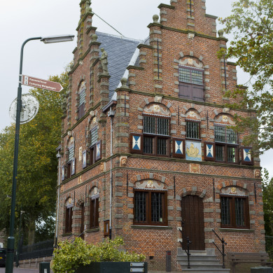 Raadhuis. Gebouw uit 1613 met topgevels aan drie zijden. Rijke architectuur met pilasters, lijsten en uitspringende blokken van natuursteen. Versiering der boogtrommels in de trant van Hendrick de Keyser.