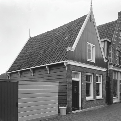 Huis onder zadeldak. Oorspronkelijke bakstenen onderbouw. Houten top op gevellijst.