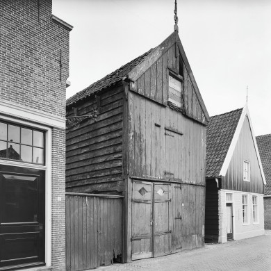 Geheel uit hout opgetrokken pakhuis, 18e eeuw. Zijgevels en achtergevel gepotdekseld; pannen zadeldak; puntgevel met versierde topmakelaar.