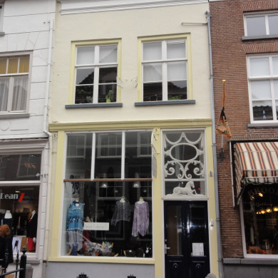 Huis op de hoek van de Scheerestraat, met gebosseerd gepleisterde lijstgevel en winkelpui XIX c, plat dak.