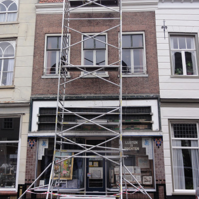 Huis met in- en uitgezwenkte topgevel (XVIII), winkelpui XIX a met middendeur en vensters tezamen een kozijn vormende.