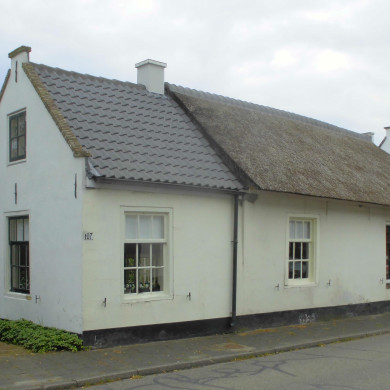 DWARSHUIS uit de 18e eeuw onder met riet en pannen gedekt zadeldak tussen puntgevels, geheel gepleisterd.