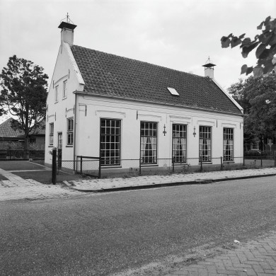 Gepleisterd dwarshuis onder rieten zadeldak tussen puntgevels, 18e eeuw. In de voorgevel vensters met luiken en negenruitsschuiframen.