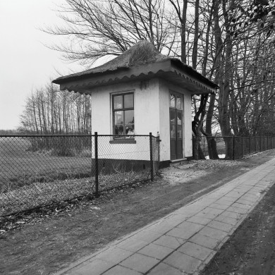 Gepleisterd dwarshuis onder rieten zadeldak tussen puntgevels, 18e eeuw. In de voorgevel vensters met luiken en negenruitsschuiframen.
