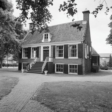 Voormalig RECHTHUIS, 18e eeuw. Dwarshuis, bestaande uit souterrain en bel-etage, gedekt door een pannen zadeldak tussen puntgevels met geprofileerde zij-afdekstukken en schoorstenen met windkappen in de as.