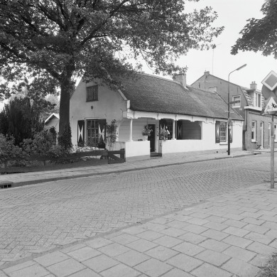 Gepleisterd dwarshuis onder rieten zadeldak tussen puntgevels, 18e eeuw. In de voorgevel vensters met luiken en negenruitsschuiframen.