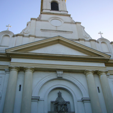 Neoclassicistische HALLEKERK met drie beuken en Jonische zuilen met rondboogarcaden. De gepleisterde voorgevel wordt geleed door pilasters en bezit een middenrisaliet met fronton. Vierkante toren boven de voorgevel. De kerk is overdekt door gestucadoorde houten kruisribgewelven. Aan weerszijden van het koor een diplomatenkapel.