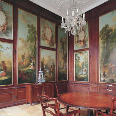 Oorspronkelijk met de nrs 26 en 30 een pand in régence stijl, Lodewijk XIV en rococo-interieurs.