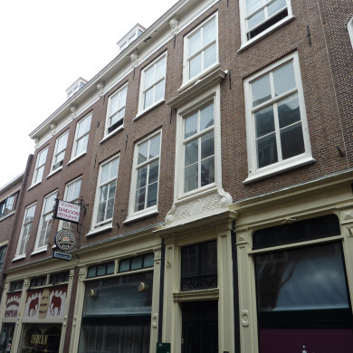 Pand met achttiende-eeuwse gevel met kroonlijst op gesneden maskerconsoles en versierde ingangspartij.