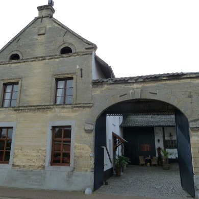 Gesloten mergelhoeve met afgedekte topgevel en twee poorten (XIX).