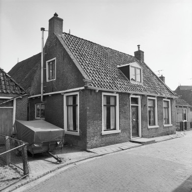 Tegen de linker zijgevel een houten schuur onder lessenaarsdak met pannen.