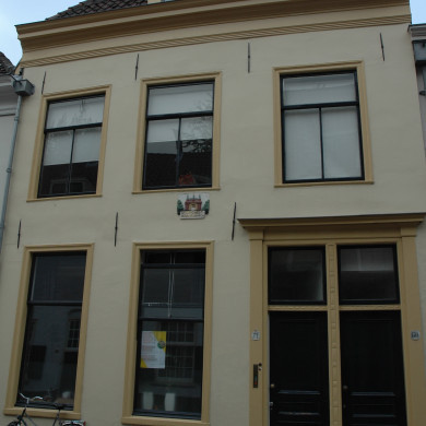 Pand met gepleisterde lijstgevel, 17e eeuw met gevelsteen "Dit Huis heet Scherpenburgh".