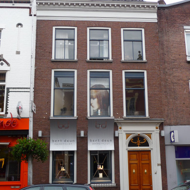 De Koning van Poortugael, hoge TRAPGEVEL, kruisvensters met halve luiken, ontlastingsbogen met natuurstenen blokken versierd, horizontale randen van natuursteen, pinakels bekroond door peikballen, goede onderpui met korbelen, hardstenen stoeppalen, begin XVII.