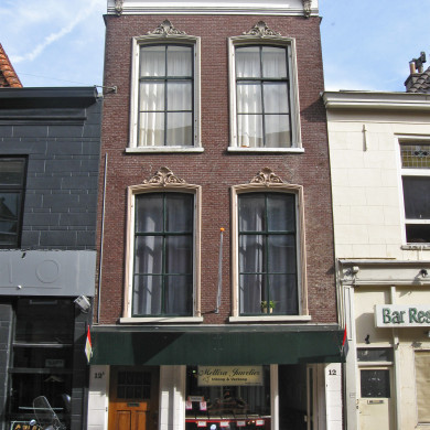 Bij 36 getrokken eveneens onderkelderd pand met klokvormige bekroning gedateerd 1730.