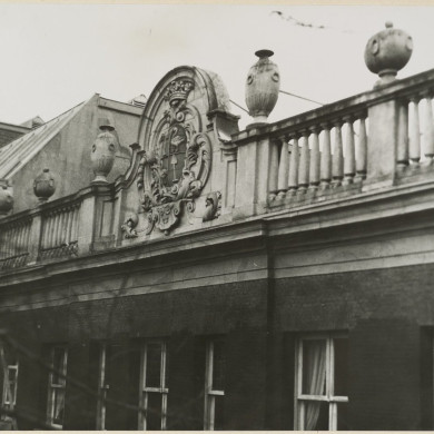 Dubbel huis met gelaagde zandstenen gevel met midden- en hoekrisalieten, deuromlijsting en balcon (1663, door Philips Vingboons).