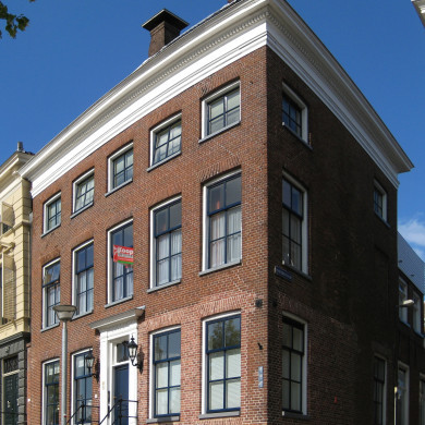 Onderkelderd pand met verdieping en lage zolderverdieping onder zadeldak, voor afgeschuind en door forse schoorstenen met bord bekroond. Boven de laat 18e vroeg 19e eeuwse gevel kroonlijst met twee consoles en bloklijst. Omlijste ingang met bloklijst.
