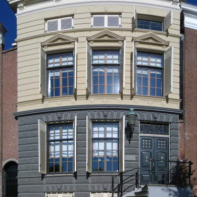 Onderkelderd pand met verdieping en lage zolderverdieping. De gevel is in de tweede helft van de 19e eeuw gepleisterd en geornamenteerd en van kroonlijst met consoles voorzien. Gesmeed hek en balies langs het bordes.