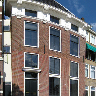 In de parterre gewijzigd pand met verdieping en lage zolderverdieping met vensters in de kroonlijst; tussen de vensters zeer grote gesneden voluutconsoles. Boven het voorschild van het zadeldak schoorsteen.