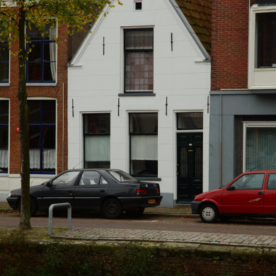 Drie traveeën breed herenhuis met verdieping. Alle vensters met zes ruiten en omgeven door stuclijsten met gestuct kuifstuk.
