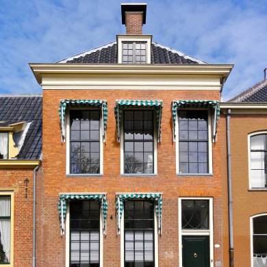 Zeer karakteristiek Gronings pand onder dwars zadeldak waarvoor grote Vlaamse top met vier gebeeldhouwde klauwstukken op de grote treden, in het bekronend tympaan gedateerd 1660; gebeeldhouwde oeil-de-boeufomlijsting en festoen in de top.