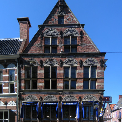 Zeventien traveeën breed pand met verdieping onder afgeknot dwars zadeldak: boven de middelste drie traveeen Vlaamse topgevel in trapvorm met kleine klauwstukken in de top gedateerd 1631.