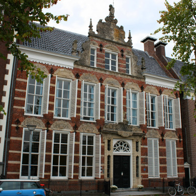 Zeven traveeën breed pand met verdieping onder dwars zadeldak tussen topgevels met forse schoorstenen. Voor de kap rijk met beeldhouwwerk versierde top, met drie schildhoudende leeuwtjes, 1624. Boven de twaalf nog aanwezige vensters schelpvullingen; evenals boven de drie topvensters. Twee der benedenvensters zijn vervangen door een bijzonder rijk met snijwerk versierde ingangspartij met zijlichten, 1723.