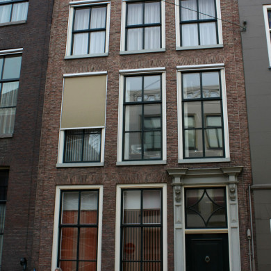 Woonhuis met verdieping en lage zolderverdieping, waarvan de vensters in de kroonlijst van de gevel staan, tussen deze vensters en terzijde grote gebeeldhouwde consoles, midden 18e eeuw. Omlijste ingang.