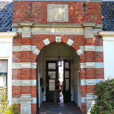 Boven de ingang van een tussen twee overbouwde doorgangen gelegen woning (van de binnenvader) steen met spreuk en geflankeerd door siertrossen, 1708. Aan de Nieuwstad pilasterpoort, vernieuwd in 1724. In de regentenkamer een gesneden schouw, midden achttiende eeuw.