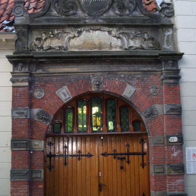 Gesloten buitengevels aan de zijde van het Kattediep met stenen kozijnen waarboven ontlastingsbogen met blokjes. Ingangspoortje aan de Peperstraat uit 1640 met gebeeldhouwde bekroning uit 1743.