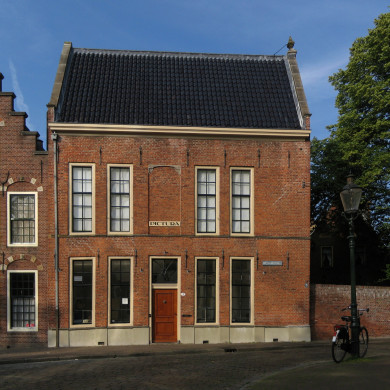Belangrijk hoekpand met verdieping en lage zolderverdieping onder hoog dwars zadeldak met voorschild tussen topgevels.