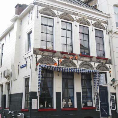Pand met verdieping. Gevel uit 1613 blijkens jaartalsteentje onder de gootlijst. Het baksteenwerk (later gepleisterd) wordt afgewisseld door natuurstenen schelpvullingen der boogtrommels boven de zeven (3 en 4) hoge smalle vensters en de ingang en natuurstenen lijsten waarin kopjes tussen de verdiepingen. Top verloren.