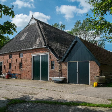 Forse BOERDERIJ waarvan het woongedeelte onder een dak met schuur is gedekt. Woongedeelte met zesruitsvensters, waarboven een serie zaadzoldervensters. Vrijstaande stookhut.