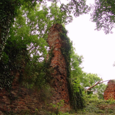 In 1944 zwaar beschadigde bouwvallen van het in de 17e eeuw verwoeste kasteel, thans bekend als het Gebroken Slot; puinheuvel temidden van overblijfsels der omgrachting.