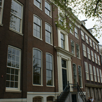 Dubbel huis met gevel, voorzien van middenrisaliet en hoeklisenen, onder rechte lijst en attiek (laat XVIIIa). Versierde stoep met 4 flesbalusters. Gebeeldhouwde ingangspartij, gesneden deurkalf. Snijraam XIX A. Inwendig: fraaie stucversiering in voorhuis en gang uit de bouwtijd.