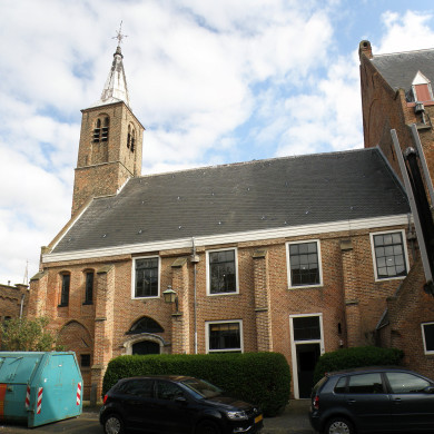 Sterk verbouwd eenbeukig schip, oorspronkelijk met verdieping voor de Begijnen, beide midden 15e eeuw, hoog koor omstreeks 1500.