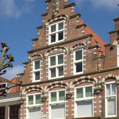 'In 't Bruine Peert', zeer fraaie TRAPGEVEL 1609, boven de ramen bogen rustend op consoles, rijk gebruik gemaakt van natuurstenen blokversiering in de gevel Haarlems type, leeuwenmaskers en ossekoppen, gevelsteen met springend paard.