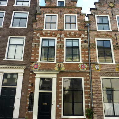 Pand met trapgevel, z.g. Haarlemse type, trant Lieven de Key, met zandstenen blokken overkragende ontlastingsbogen rustend op kraagsteen met koppen. Drie gevelstenen. 1e helft 17e eeuw.