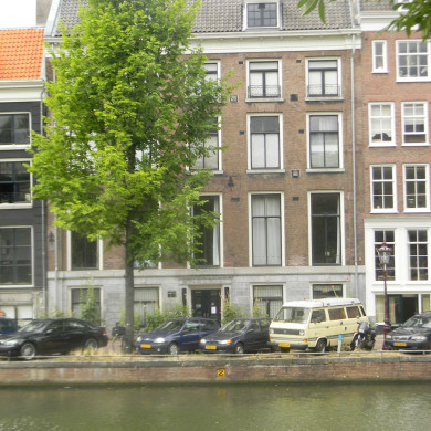 Fors huis met rechts aangebouwde lagere travee (XVIIIa). Gevel met middenrisaliet en zijlisenen, onder rijk versierde verhoogde lijst. Zandstenen hoofdverdieping waarboven (XIX B tot erker verbouwd) balcon. Gesneden deur en stoepleuningen empire. 6 stoeppalen.