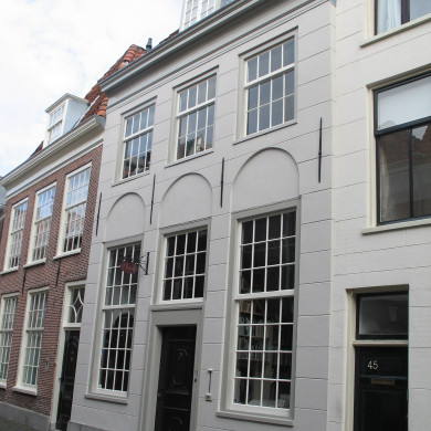 Pand met gepleisterde lijstgevel met hoge bogen boven de beneden-vensters, begin 17e eeuw.