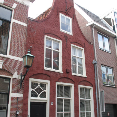 Pand met gepleisterde lijstgevel met hoge bogen boven de beneden-vensters, begin 17e eeuw.