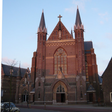 Driebeukige neo-gotische hallenkerk met transept.
