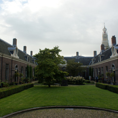 Teylershof, 24 huisjes rondom rechthoekige ruime binnenplaats 1785-1787 naar plannen van Leendert H. Vierkant gebouwd.