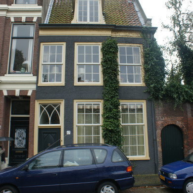 Statig breed PATRICIERSHUIS, hardstenen stoep en souterrain, gebeeldhouwde middenrisaliet, bovenste venster door vaasvormig ornament bekroond.